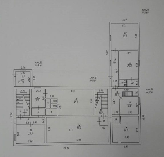 - Имеет три этажа: подвал - 62 кв.м., первый - 346 кв.м., второй - 252 кв.м.;