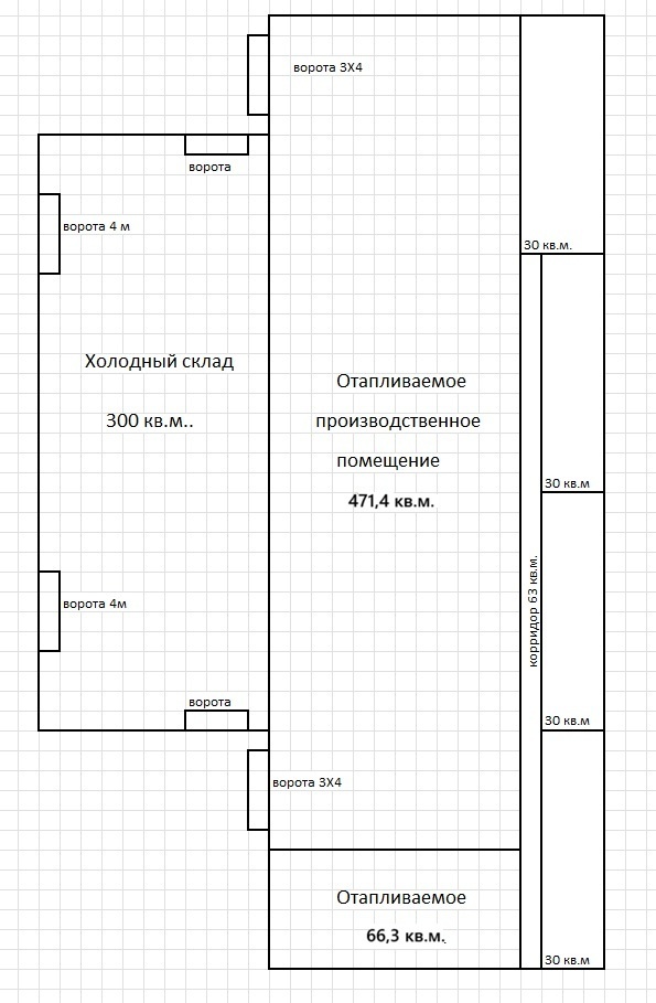 2. Здание капитальное, на жб колоннах. Стены из газоблока.Основной отапливаемый цех площадью 668 кв.м. с подсобными, производственными и складскими помещениями (см. на схеме) и антресольным этажом оборудованным под офис. Имеет двое ворот (ширина 3 м, высота 4 м). Размеры производственного цеха : длина 42 м, ширина 12 м, высота 7 м. К отапливаемой части пристроен холодный склад площадью 300 кв.м. (3х10 м).