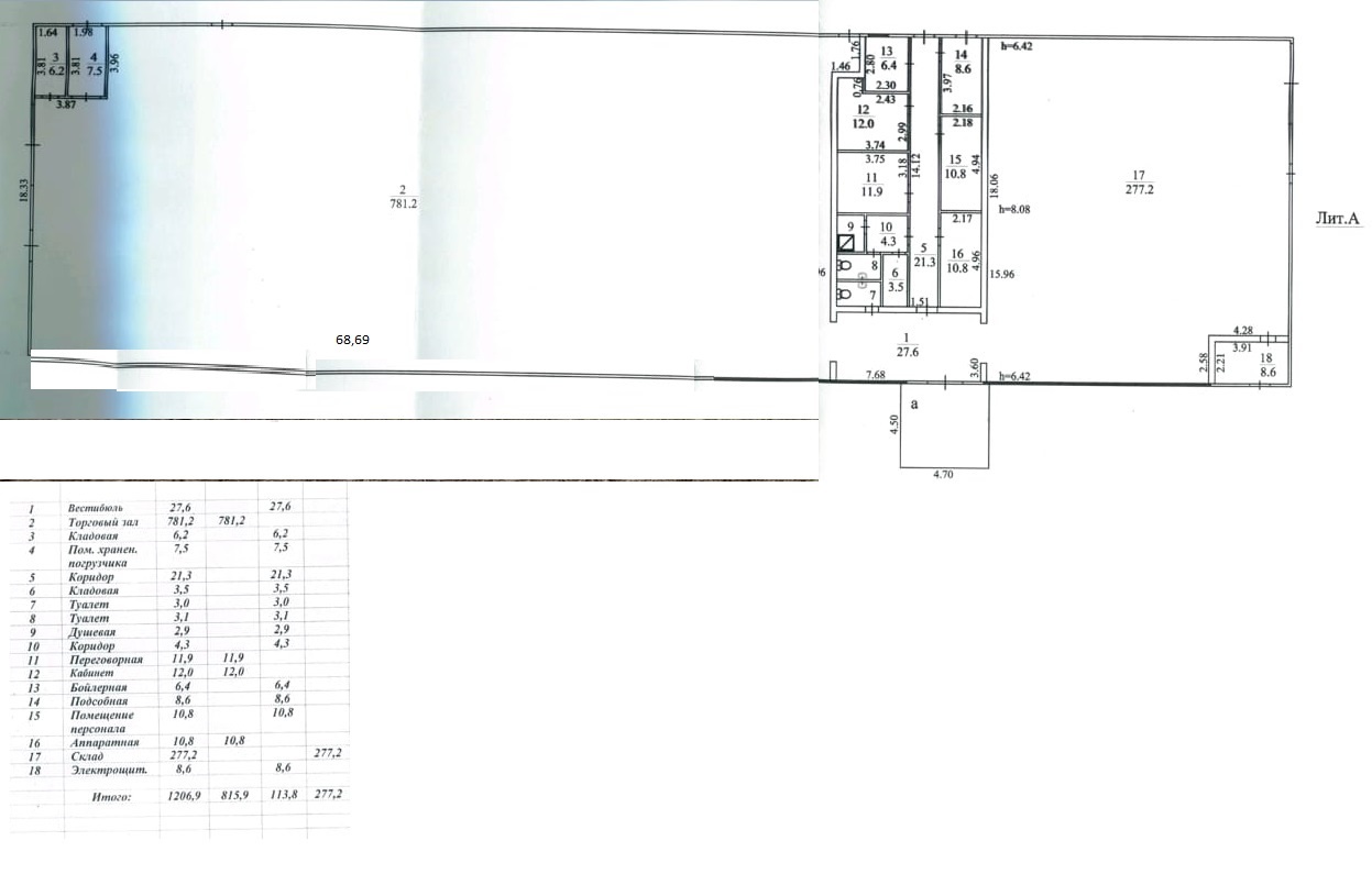 Нежилое здание, открытой планировки, прямоугольной формы, с размерами 68 на 18 метров,